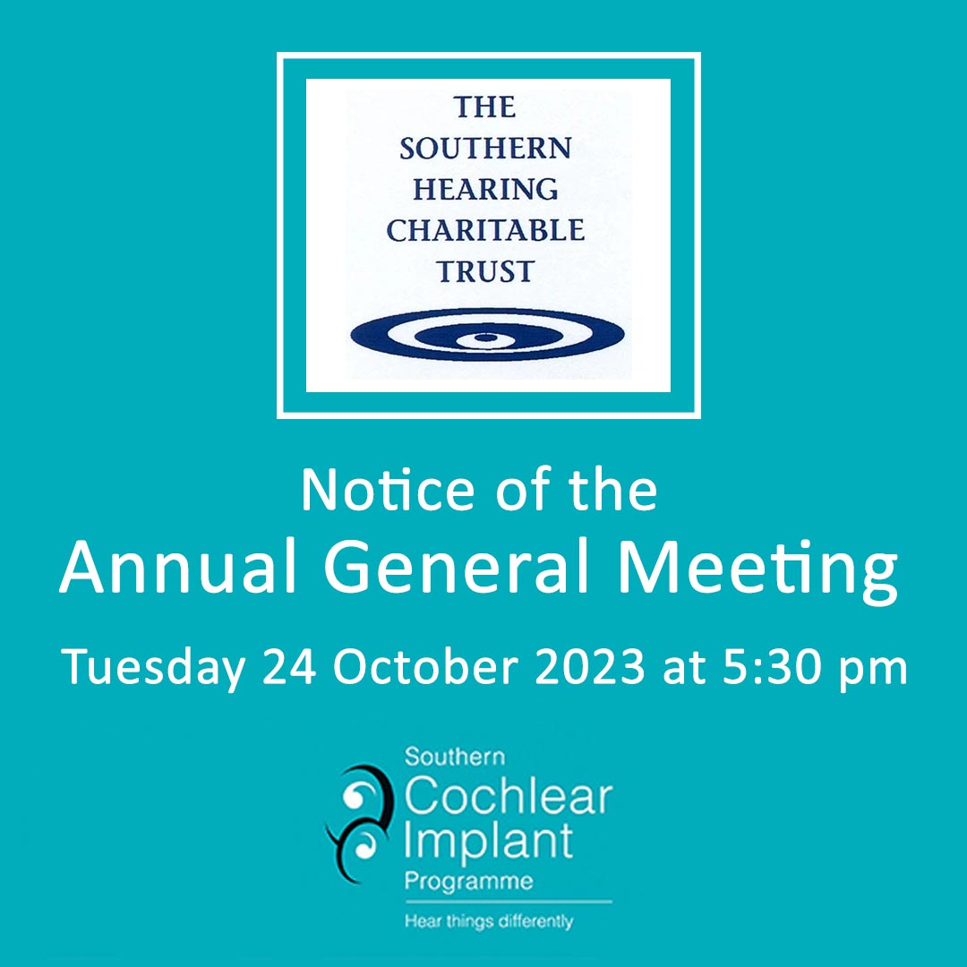 DetailsThe Southern Hearing Charitable Trust is holding its AGM on Tuesday 24 October 2023 at 5.30 pm at its Milford Chambers rooms in Christchurch. Details can be found here.